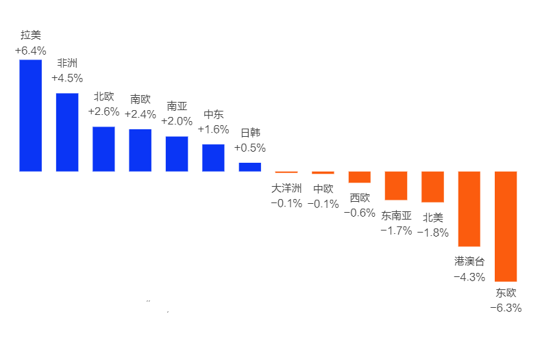从2021年全球手游广告量占比来看,新兴市场展现出的增长趋势更加明显。其中,拉美地区以6.4%的涨幅成为2022年手游广告量占比同比增长量最高的市场。而诸如东欧、东南亚和北美市场,均呈现出不同比例的降幅。