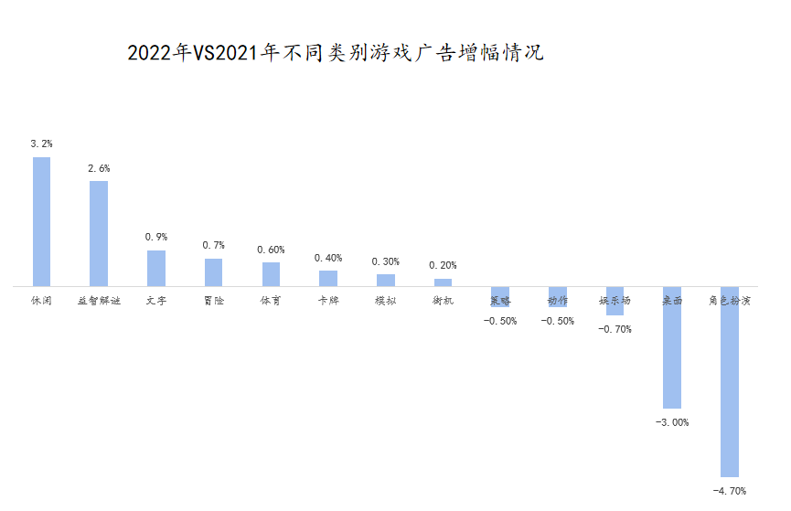 而降幅最高的游戏品类是角色扮演类,广告量占比同比下降4.7%。这类游戏广告降幅较大的原因在于,2022年买量成本的不断攀升以及回收周期的持续拉长,这让以角色扮演为代表的传统中重度游戏品类,无法再单纯依靠买量获得增长。同样,对于家底不厚的中小游戏厂商而言,也必须要迅速找到新的营销策略。