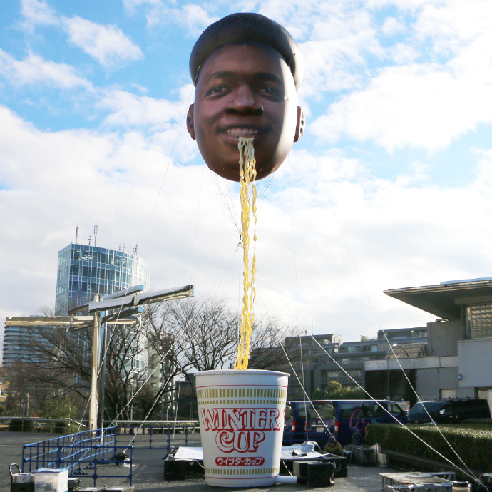 还有日清泡面,同样直接把人头挂天上,和日本恐怖漫画家伊藤润二的作品《人头气球》如出一辙。