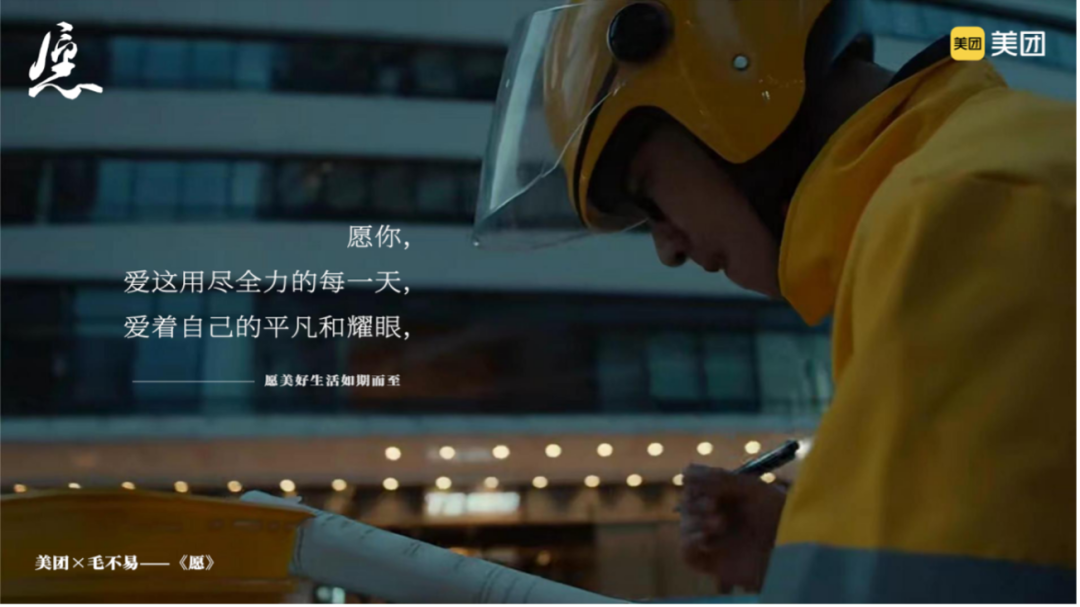 比如春节期间,美团邀请毛不易打造了一曲《愿》,聚焦每一个努力生活的普通人的故事,为他们送上新一年的祝福与鼓励。对于很多普通人来说,过去的一年经历了太多,关于梦想、工作、生活都有许多愿望。而伴随着疫情政策的转变,一年已经画上了句号。正如歌词所写“在路上的人总是一个样,一步一响踏着迷惘,和自己较真磨不灭的倔强”,已经到来的2023年无疑承载了很多人对未来的愿望与憧憬。正是基于这样的时代情绪洞察,美团在春节团圆的常规营销路径之外,不仅找到了一条差异化的传播思路,更让品牌跳脱春节场景之外,将营销的穿透力与情感力都延伸到春节之外。在外打拼的年轻人、刚毕业但找工作屡屡碰壁的女孩、一边送餐一边怀揣梦想的骑手、在疫情中逐渐凋敝的花店老板、在疫情中年迈互相陪伴的老夫妻……美团通过《愿》把视角深入到每个普通人现实的生活语境,记录每一个人简单、微小的愿望。传达每一个愿望无论大小,都值得尊重。也因此,美团通过这首音乐短片《愿》在春节期间极大开拓了与广大用户的共情空间,网友们纷纷留言,表达自己与这首《愿》的美好共情。可以说,对于品牌而言,如何捕捉社会情绪价值的最大公约数,是品牌创造新鲜的关键。而美团所做的,正是将品牌与大众憧憬及文化向往做融合,不仅创造了品牌进入人群的最好切入点,也在与大众时代情绪的共振中,将春节的营销价值延展到了春节之外。05
