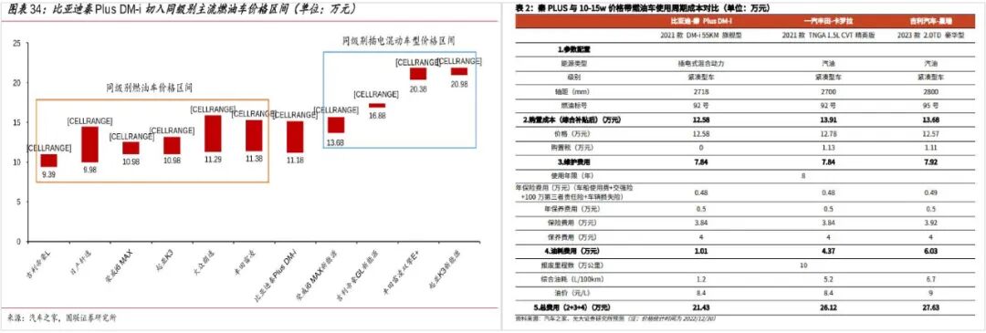 以比亚迪秦plus DM-i为例,其11.38-15.28万元的售价,直接切入了国内乘用车市场销量第一梯队的日产轩逸、大众朗逸等车型的价格带。