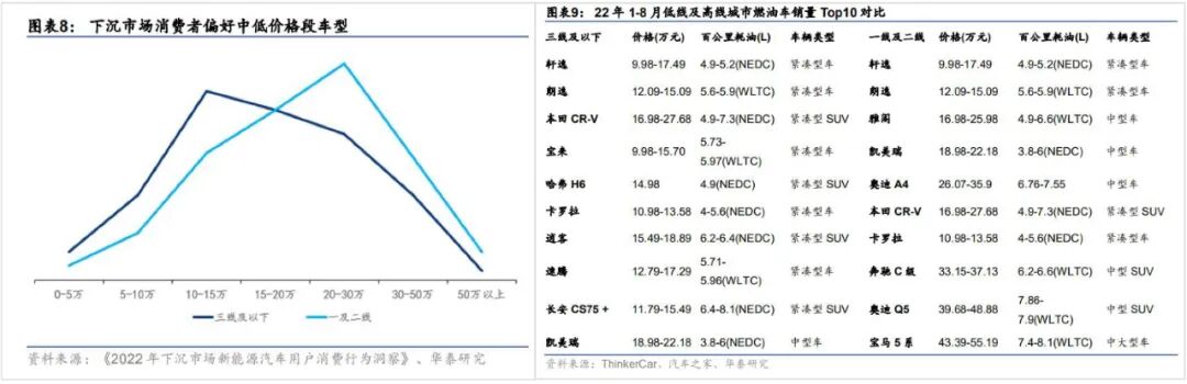 可以看到,燃油车方面,人们在价格偏好上,更集中于10-20万的车型;同时,也很追求燃油经济性,如下图,下沉市场畅销车型大多为低油耗。