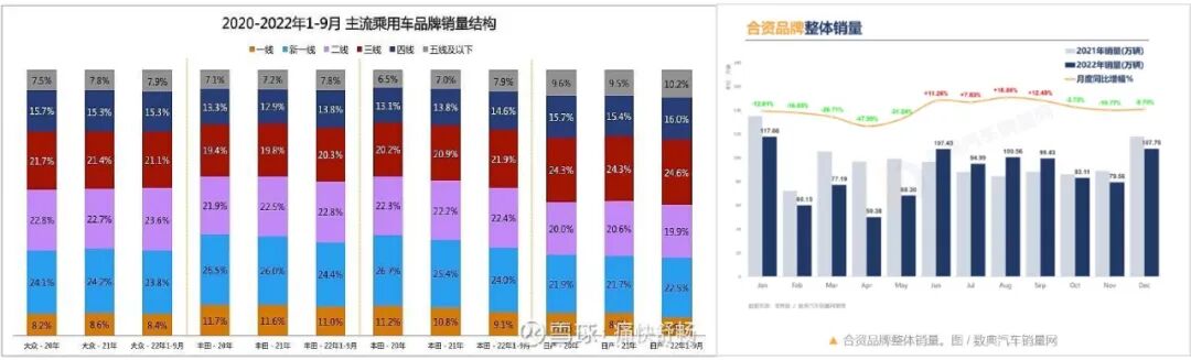 直接的替代效应冲击下,可以看到,2022年合资品牌销量几乎全线下滑,同比降幅接近10%,尤其第四季度,同比下降37.9%。