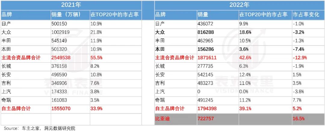 市场份额的表现,也是一样。测算显示,在10-15万价格区间的TOP20销量中,2021-2022年,主流合资品牌的市场份额下降了13%,其中本田和大众下跌最为明显。