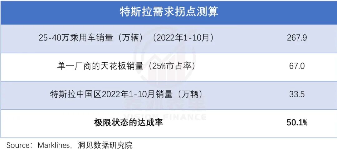 特斯拉就是类似情况,其需求回落的时点,销量渗透率正对应“需求拐点”特征。如下图,特斯拉2022年1-10月的销量达到了天花板(单一厂商市占率25%的销量)的50%。