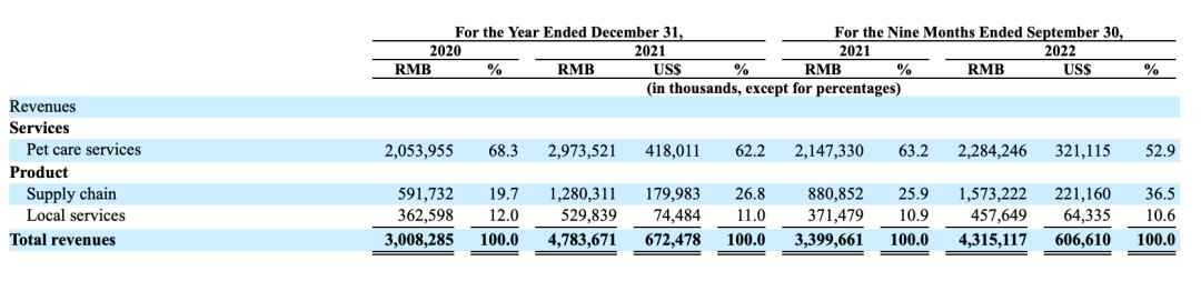 具体到新瑞鹏的三大主营业务,2020年、2021年及2022年前三季度,宠物医疗服务占总营收比分别为68.3%、62.2%及52.9%;供应链服务分别占总营收的19.7%、26.8%及36.5%;本地生活服务为12%、11%及10.6%。