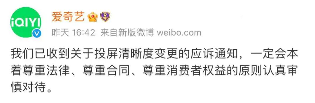 2月1日,爱奇艺发文回应称:“我们已收到关于投屏清晰度变更的应诉通知,一定会本着尊重法律、尊重合同、尊重消费者权益的原则认真审慎对待。”