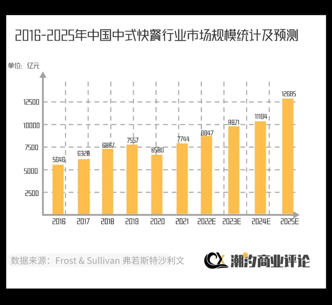 据Frost&Sullivan数据显示,中式快餐市场规模自2016年的5646亿增长至2019年的7556亿,预计到2025年突破万亿大关。