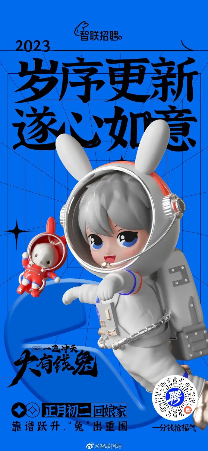在影片中,小智在森林中漫步时遇到了灵感邦尼,遂邀请它一起登上太空船,进行了一场说走就走的职场“星际穿越”。他们一起从靠谱星球发出新春祝福“2023一飞冲天,大有钱兔。”