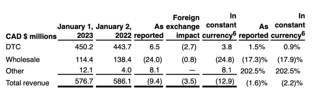 近日,羽绒服品牌加拿大鹅发布了截至2023年1月1日的2023财年第三财季业绩报告。数据显示:
