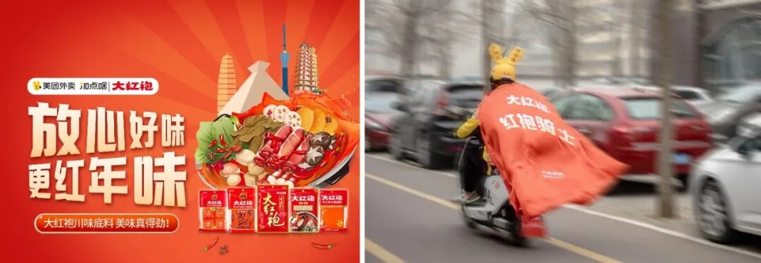 线下,大红袍跨界美团外卖,联合发起“红袍骑士”送星厨到家的事件营销,让获奖厨师们亲自上门为消费者烹饪年夜饭菜品,使消费者足不出户就能享受到最红年夜饭的美味,让赛事成果和品牌产品真正走进消费者的生活中。