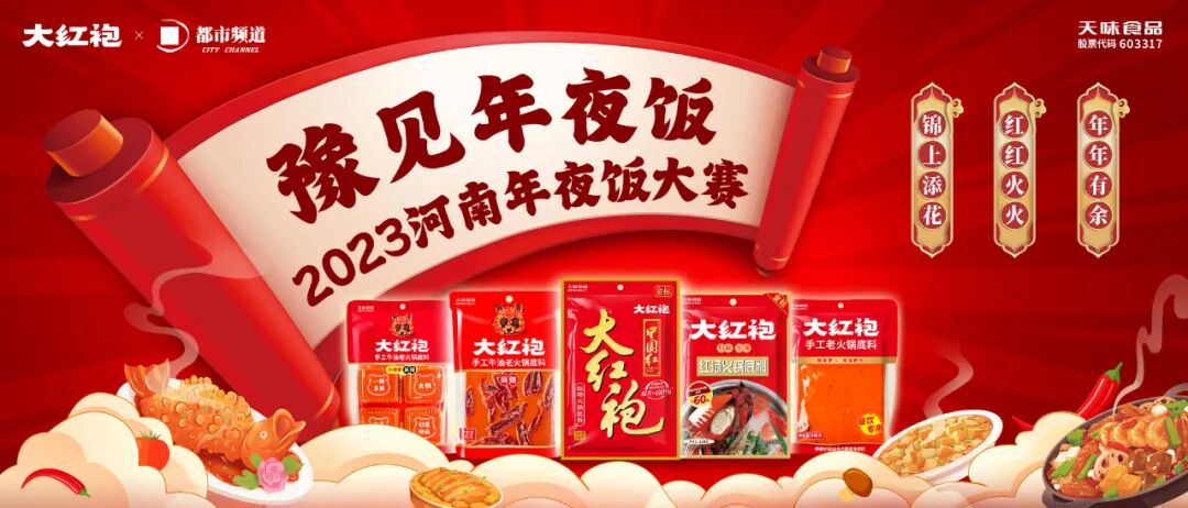 首先,大红袍联合权威媒体——河南电视台都市频道,携手权威机构——河南餐饮与住宿行业协会,从餐饮端发力,举办极具专业性和观赏性的“豫见年夜饭——2023河南年夜饭大赛”,邀请河南知名餐饮的顶级主厨同台竞技,从色、香、味等专业维度,从菜品的立意、创新等文化维度,进行多轮PK,最终评选出“2023河南最红年夜饭菜单”。