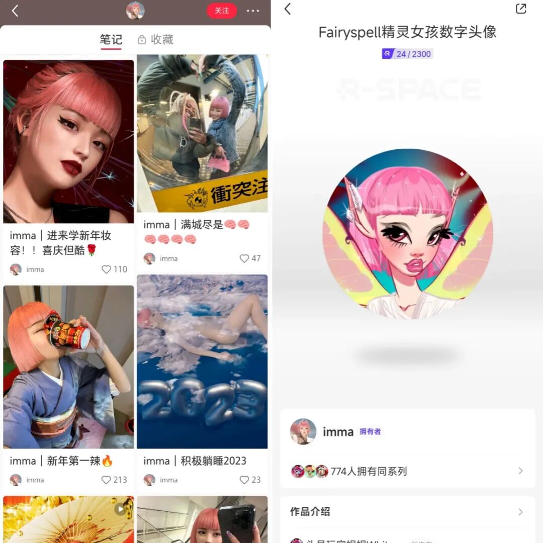 为了给自己的数字藏品平台造势,小红书推出Fairyspell精灵女孩系列数字头像,一边联动明星伊能静、头部KOL助阵,一边找来亚洲首个虚拟人imma造势。