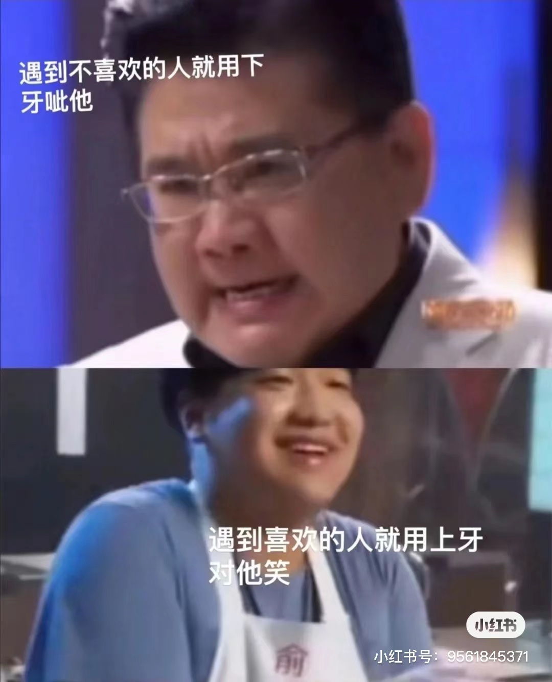 这个梗,起源于 2012 年东方卫视的一档综艺节目——《 顶级厨师 》,凭借“保留一部分味道的大肠”和“评委试吃的狰狞面色”,吊打春晚小品。