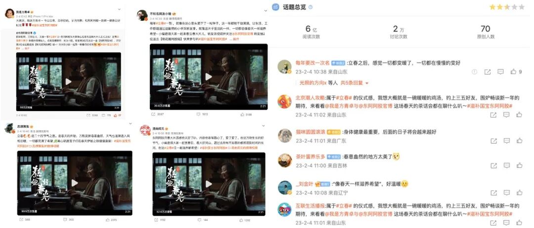 再到今天这支春意盎然的立春短片,我们可以清晰地看到东阿阿胶除了年轻化的营销活动和趣味的传播内容之外,还在用情感、天地和传承去对话年轻人。用温度、走心、诗意的内容去丰富品牌形象。不仅借势品牌自身深厚的影响力,挖掘老艺术家特质与素人演员的化学反应。还布局多圈层垂直扩散营销,引发各圈层KOL纷纷翻牌,逐层打透目标用户。旨在打造有内容、有深度、有传承、有影响力的“传播货币”,在社交媒体行成话题场,达成了6亿的传播量。