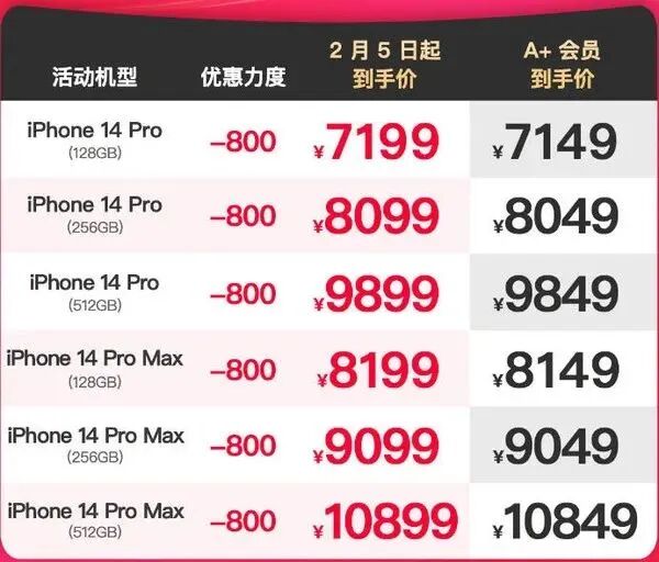 据业内人士透露,苹果从2月5日开始推出活动,iPhone 14 Pro系列全部版本迎来700元优惠,起售价仅7299元。活动截止日期为4月1日,范围几乎覆盖所有授权门店。