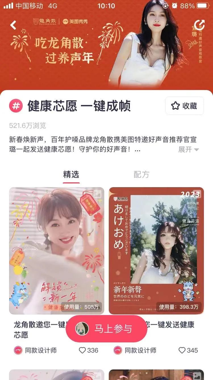 拉新促活,在品牌营销中也占据着重要地位,是品牌不断焕发活力的关键所在。但大多数情况下的拉新促活只是堆起了一时的流量,并没有将流量真正转化为品牌用户、品牌粉丝。基于此,美图平台搭建黄金流量池,为品牌拦截原生路径兴趣人群,同时以明星同款玩法+站内外资源宣推,在岁末营销中高效地解决了品牌粉丝转化和人群复购的营销痛点,将流量和人群的价值发挥到了最大化。一方面,美图平台月活用户高达2.4亿+,每月产出的影像数量也有70.2亿,其中春节期间,全网每10张新春影像有6张源自美图,庞大的用户群体为品牌们提供了黄金流量池,聚拢大量潜在消费人群。另一方面,美图平台自孵化了15w+高颜值优质达人,以及美图S++级运营资源推升站内外声量爆发,助力品牌占位美图新春流量高地。以龙角散为例,在春节营销期间,当红明星宣璐担任美图特邀好声音推荐官,以明星同款卷动粉丝经济的同时,美图优质达人从品牌新春配方试玩、产品试吃等多角度种草,吸引更多用户参与互动。同时,美图也聚焦平台站内外资源,以APP开屏、热门话题、主页卡位等硬广资源拉动强势曝光,并引导跳转至品牌落地页,加速转化高潜质人群。