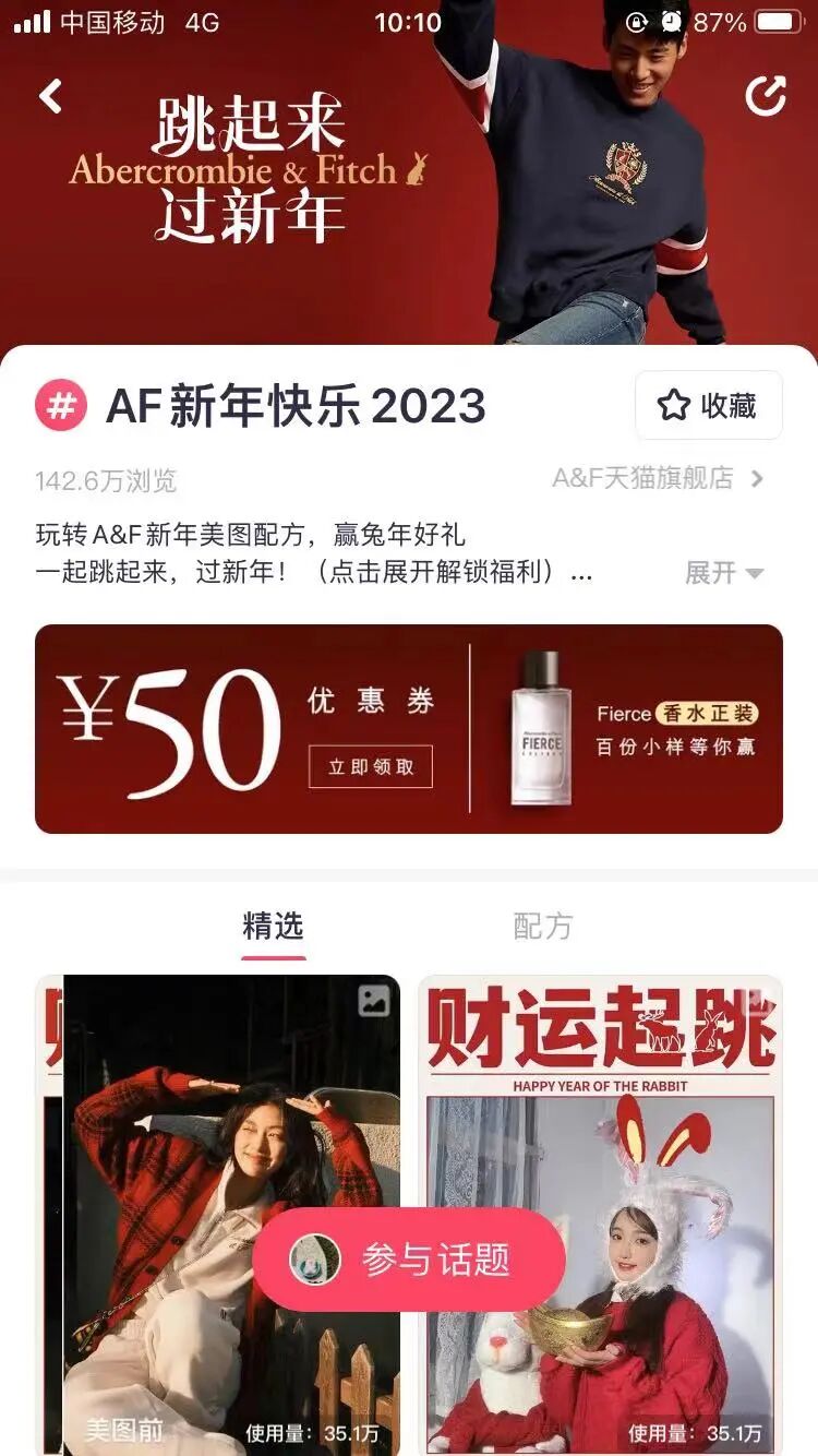 这一届消费者相较于过往,一大特点就是“重体验”。品牌活动中,他们早已不再满足于做被动的信息接受者。因此,新颖、丰富、有内涵的交互行为,才是深化品牌认知、强化情感链接的利器。对此,美图平台为品牌们准备了对应玩法:以“H5专题+新春话题”双阵地组合承载,结合多元创意内容和共鸣式场景与消费者展开情感共情,进而建立起深度的品客关系,实现多次触达和转化。比如在新春还「圆」专列的每一节车厢,美图都提供了一种新年还圆玩法灵感,结合龙角散草本夹心糖的产品特性,设计了相应的影像贴纸,让用户在不同的场景之下户沉浸式感受过年圆满氛围。而「新年一帧还圆」的话题页,则将用户想要体验的节点氛围以更集中的方式,汇聚在一个可以交互的载体当中,而品牌内容则给予了新春体验一种全新的表达。与此同时,美图平台还结合春节不同主题情感为品牌设计了春节限定配方,让用户沉浸在节日氛围中,也让品牌同时攻占多个场景空间。比如春节期间,美图平台分别在跨年、除夕两大节点为A&F定制了专属的新年大片,以此满足不同场景下用户的交互体验。高级感画框结合烟花、柔光滤镜,适配各类新年场景;兔耳等贴纸元素与融入品牌元素的祝福文字,烘托除夕年味的同时,也不失萌趣感。在新的赛道中,美图通过场景+内容的生态布局,不断的给予用户与品牌新的刺激,由此产生新的营销方法论,再反作用于用户与品牌,从而不断的提升整个营销链路的商业能力,品牌在此过程中也不断重组品牌资源盘活营销增量,提升品牌的品效协同能力。从整体效果上来看,活动帮助品牌获得了13.7亿的总曝光。