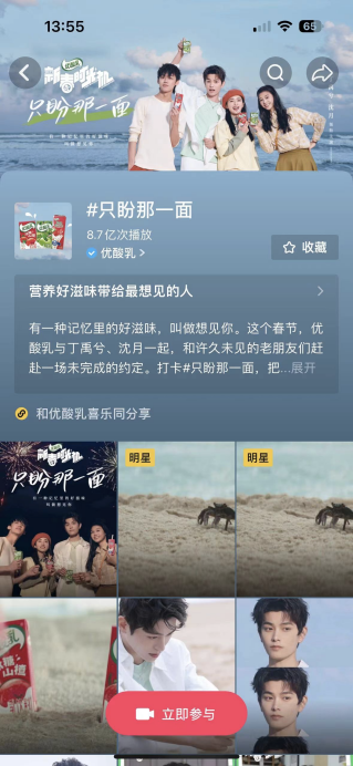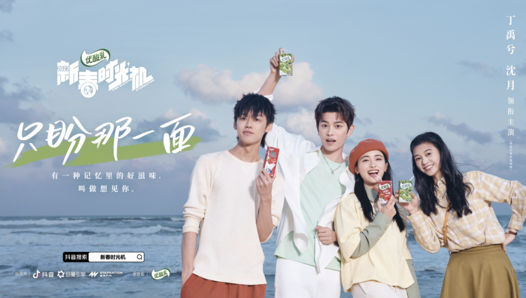 在心智种草层面,优酸乳基于抖音阵地,结合多平台传播完成差异化沟通。在抖音平台,优酸乳掀起沉浸式社交新体验,主话题#新春时光机 总浏览量达到131亿+,50+明星艺人、抖音创作者拜年造势,送出新春祝福。