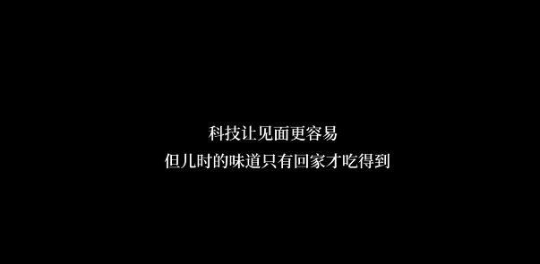 “现代营销学之父”利普·科特勒有一个观点:“新一代的营销必须是价值观营销,更注重企业的人文关怀和社会价值。”诚然,作为以盈利和促销为目的商业广告,除了要向受众传递产品信息以外,还应该承担社会责任感,传播人文关怀理念。中国移动这波春节返程Campaign,可以说称得上是一次人文关怀理念与商业广告的完美融合。看完这支影片,你会发现全程没有任何产品信息露出,专注于将故事娓娓叙述。到了影片的最后一幕,广告主旨才得以突显。日新月异的科技让见面变得容易,但是记忆中的美味只有回家才能吃得到。中国移动向受众阐述了团圆的意义,即便科技如何进步,也替代不了家之于我们的重要存在。