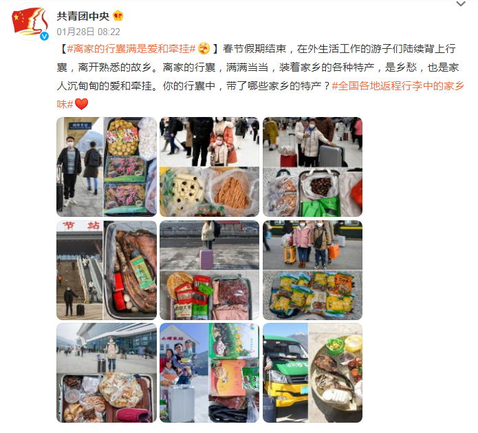 从过去三年的“云团聚”到如今的“团圆年”,2023年春节终于迎来了阔别已久的重逢。去时一身轻,人们满怀思念和期待归家;来时“千斤重”,离家行囊满载爱与乡愁。这是2023年春节返程旅途中随处可见的一幕。来自老家的土鸡蛋、精心腌制的腊肉酱菜、一张张摊到深夜的煎饼......满满当当的行李箱,装着的不仅是琳琅满目的家乡特产,更是父母沉甸甸的牵挂。