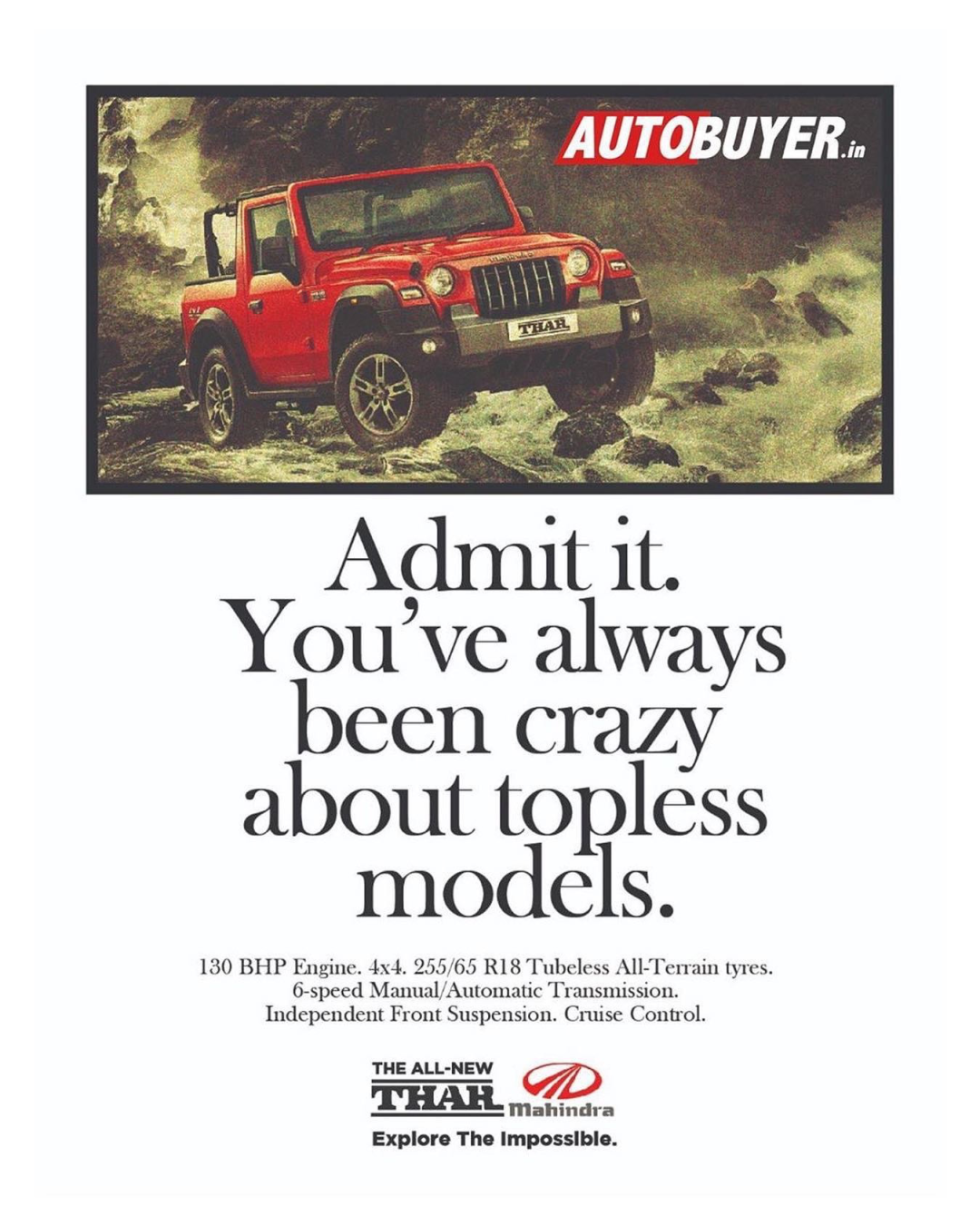 很多朋友都有这种经历,在网上看小电影,每每看到兴头时,总会被各种打断,要么弹出窗口,要么“仅限会员”,这种感觉就像这组广告展示的这样,总在关键部分“打断”你,一语双关地道出很多LSP的痛点。Admit it You've always been crazy about topless models.英文单词“Topless”,本意是“赤裸”的意思,但从字面上看也有“敞篷”的意思,发现了这个巧妙双关之后,印度马恒达汽车的文案就开始整活了。品牌对这句文案非常满意,一用就是很多年。期间换过多种车型,甚至品牌slgoan都换了,这句文案都没换。Slogan:野性的呼唤(The call of the wild)Slogan:探索不可能 | Explore The Impossible04