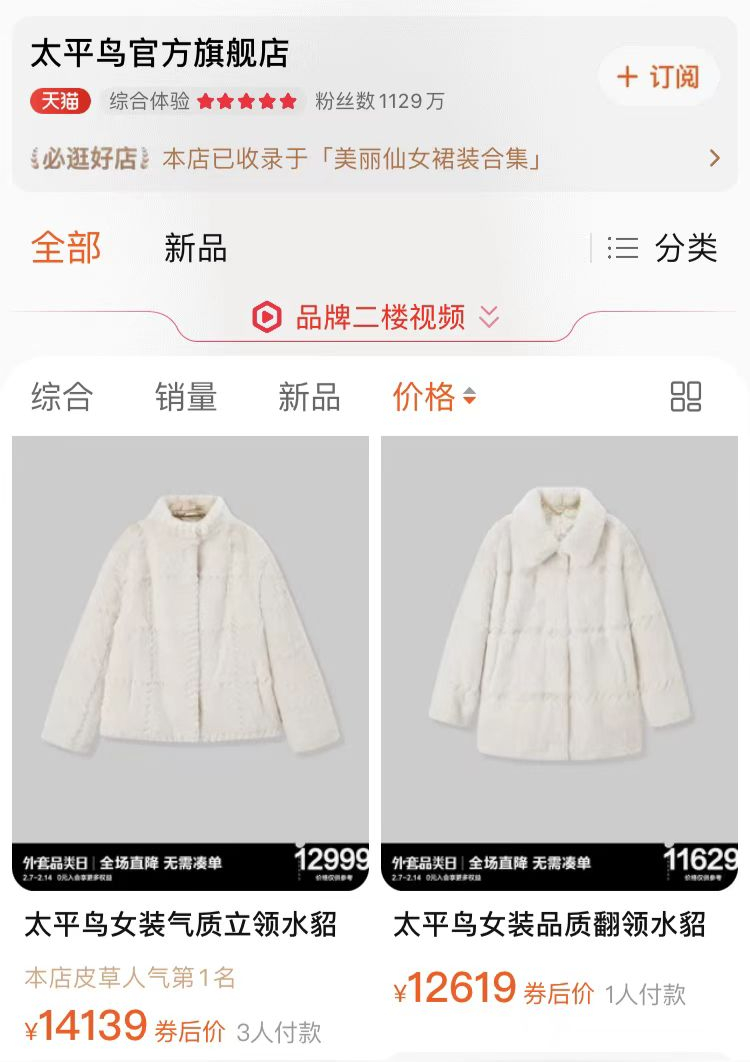 比如,在太平鸟官方旗舰店,2022年秋冬新款的全驼绒大衣售价为4609元,更有售价高达14139元的水貂皮草。