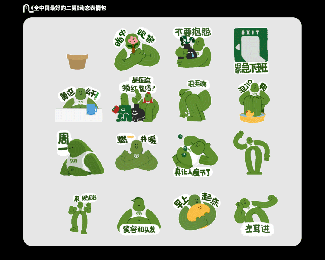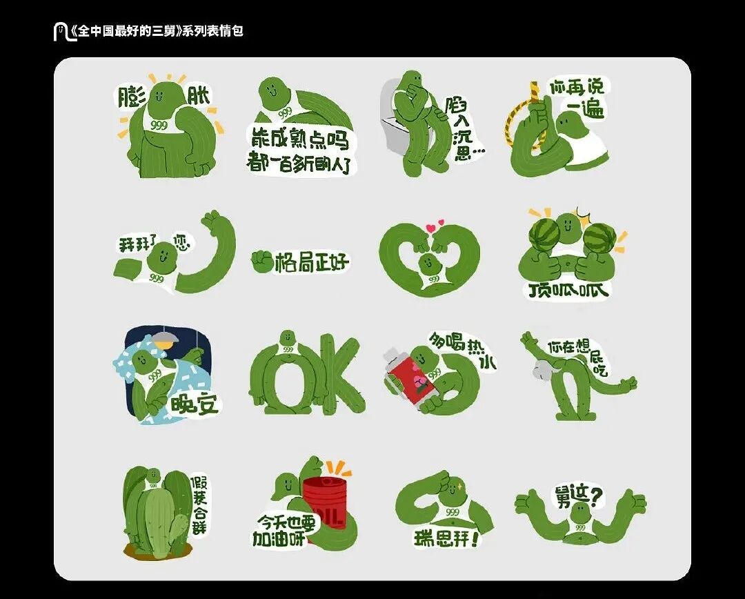 而以三舅延展出来的表情包设计,通过搞怪的动作和多变的神情,让IP形象更加生动鲜活。