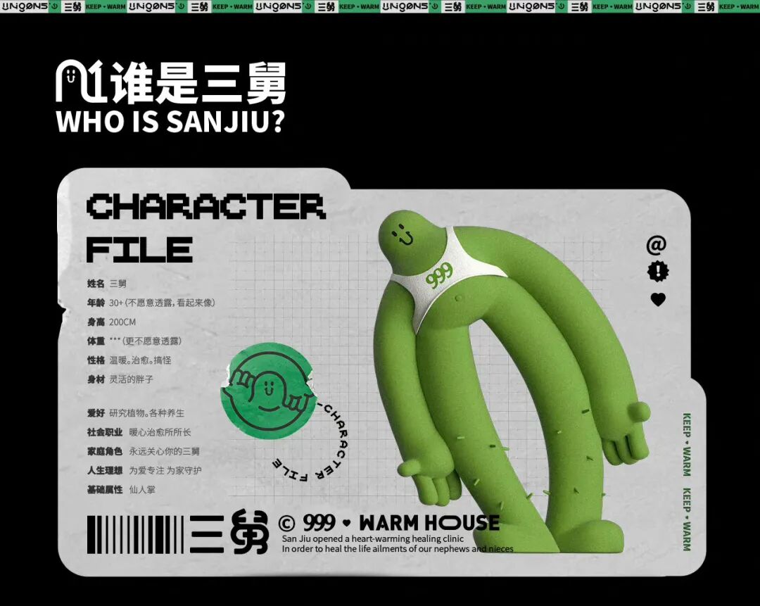 三舅是以仙人掌为原型设计,据称体现的是IP特征定位为具有超强的自愈能力,这和999品牌产品属性具有一定的关联。