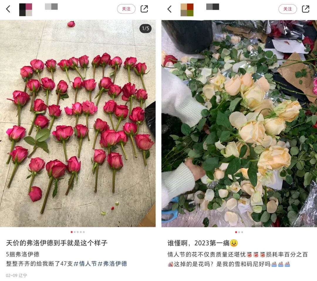 “钱呢?进货了。货呢?卖了。赚的钱呢?进货了……花店是处于最后一环的接盘侠,简直是被割了韭菜。”小红书上有花店老板忍不住发帖吐槽。