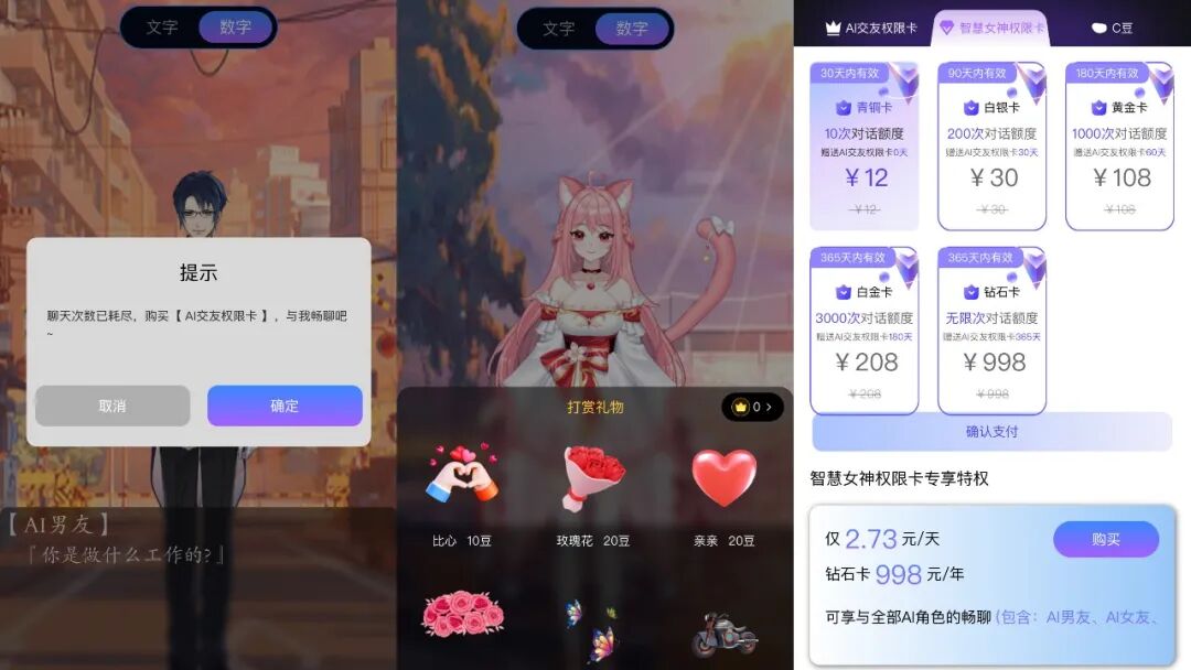 锌刻度从充值界面看到,“智慧女神”与“AI女友”“AI男友”的充值渠道并不相通。智慧女神权限卡有五个档位,价位最低的青铜卡售价12元/10次,有效期30天,不赠送AI交友权限卡;价位最高的钻石卡998元/无限次,有效期365天,赠送365天不限次AI交友权限卡。而仅针对“AI女友”“AI男友”的AI交友权限卡单独充值的方式为包月形式,月度VIP售价为25元,季度VIP售价为40元,年度VIP的售价为50元。
