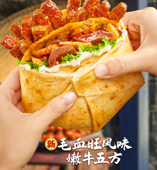 传统的毛血旺,多以鸭血为主料,再加上毛肚、肥肠、豆芽、午餐肉等食材组成,麻、辣、鲜、香四味俱全,是一道非常经典的川菜,但对于「毛血旺风味嫩牛五方」来说,唯一能和毛血旺挂钩的,就是里面馅料的几片鸭血,以及含量极低的肥肠,除此之外,很难将毛血旺与肯德基新品所联系起来……