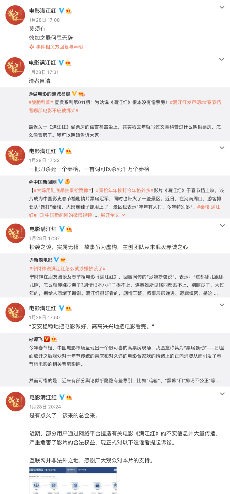 负面缠身的《满江红》在复工第一日便开始危机公关,连发多条微博,逐点澄清谣言,甚至搬出了法律手段起诉“造谣大v”,气势十足。