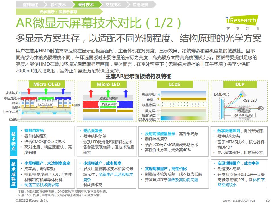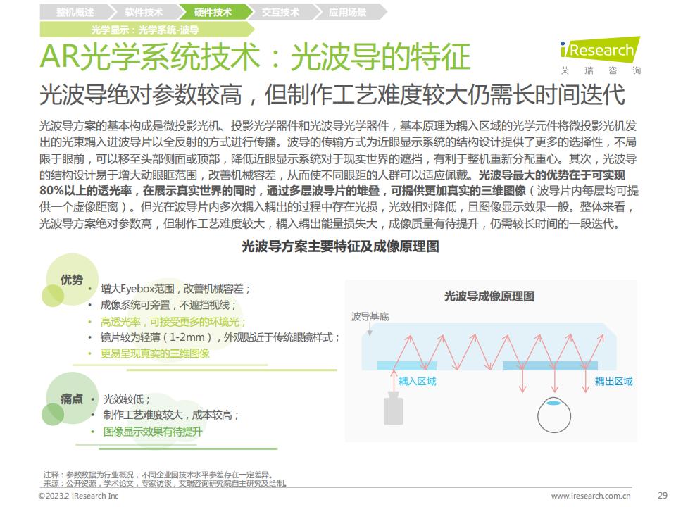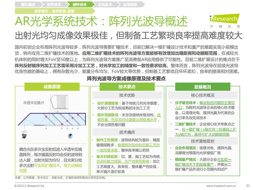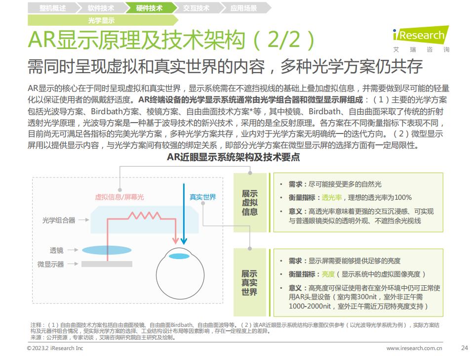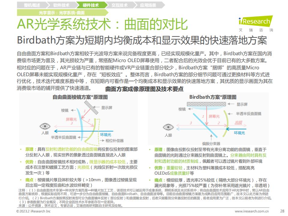 •光学显示:包含全新光学系统技术,配合微显示屏幕组成光学模组,是AR终端设备最为核心部分。Birdbath+Micro OLED方案和自由曲面方案已率先落地并实现规模量产,阵列光波导和衍射光波导技术绝对参数较高更具未来,但制作工艺难度较大仍需长时间迭代。