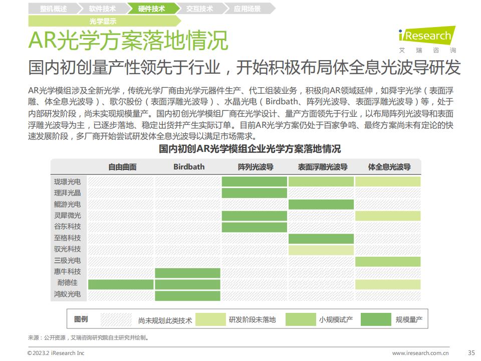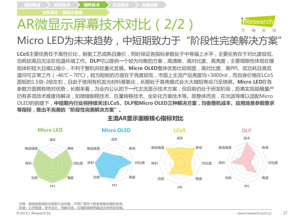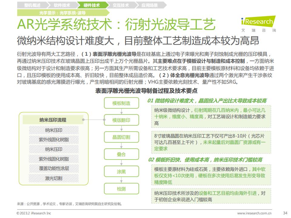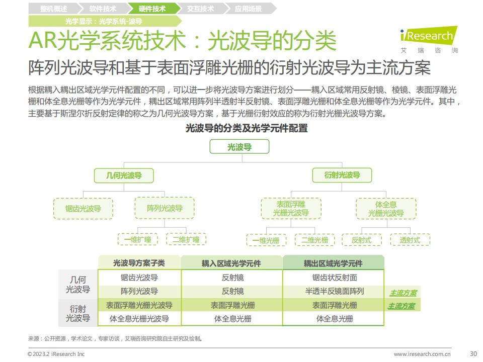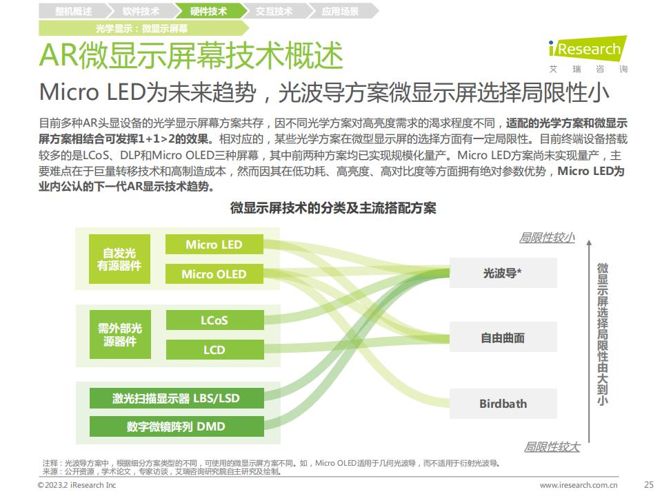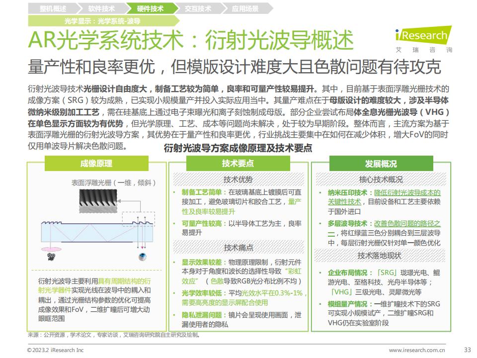 •光学显示:包含全新光学系统技术,配合微显示屏幕组成光学模组,是AR终端设备最为核心部分。Birdbath+Micro OLED方案和自由曲面方案已率先落地并实现规模量产,阵列光波导和衍射光波导技术绝对参数较高更具未来,但制作工艺难度较大仍需长时间迭代。