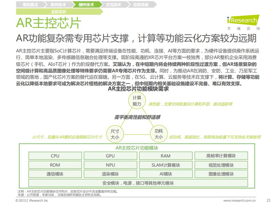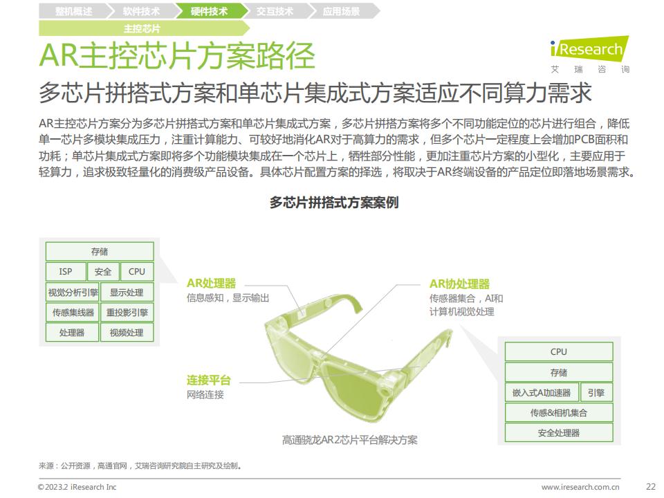 •主控芯片:AR功能复杂需专用芯片支撑,计算等功能云化方案较为远期