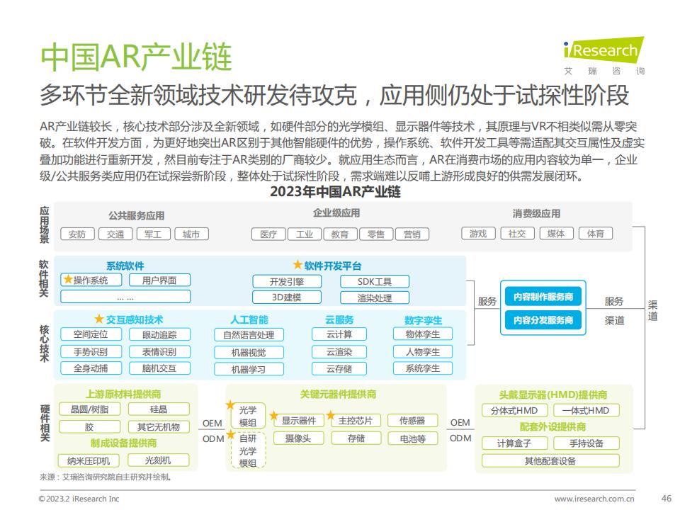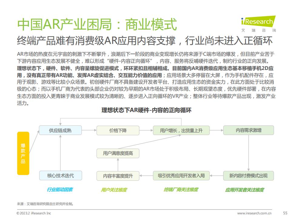 发展困局:(1)AR产业链较长,目前整体技术尚不成熟,单一环节的提升难以撬动全行业的攀升,产业内外的技术驱动力有限。(2)终端产品难有消费级AR应用内容支撑,没有真正带有AR功能、发挥AR虚实结合、交互能力价值的应用,行业尚未进入正循环。