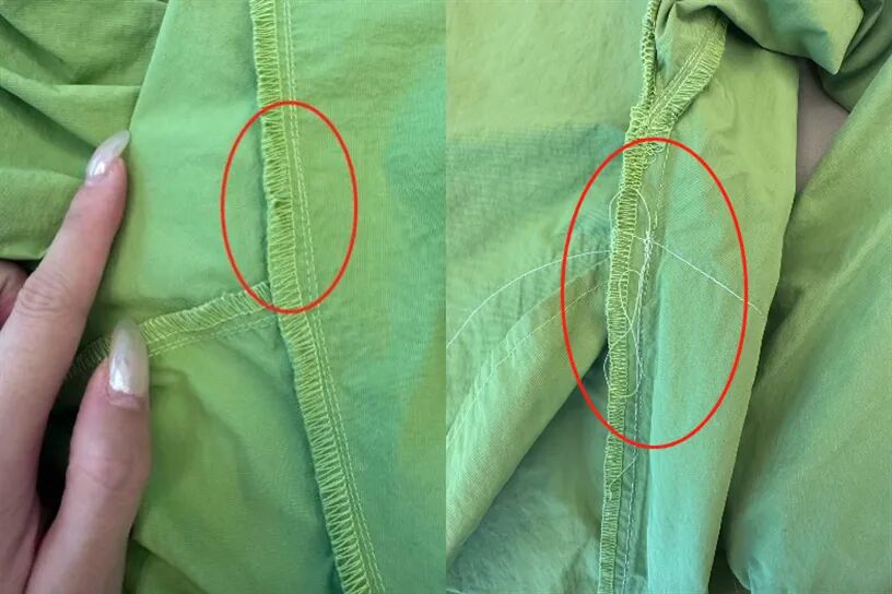 从博主晒出的实物图来看,这件外套裁缝歪七扭八,线头乱窜断线,内里没有锁边,车工肉眼可见的差劲。