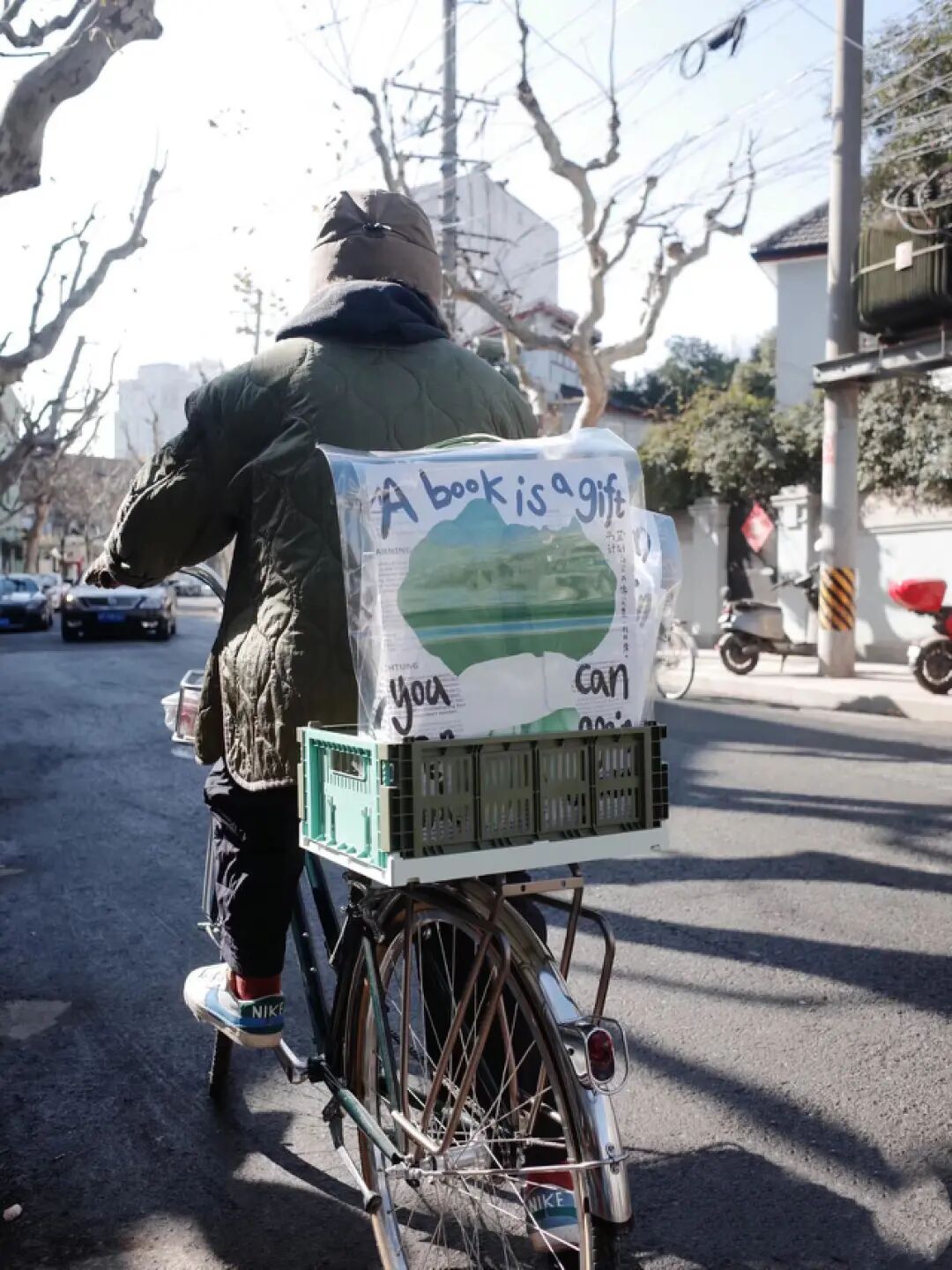 把海报放在自行车后座上