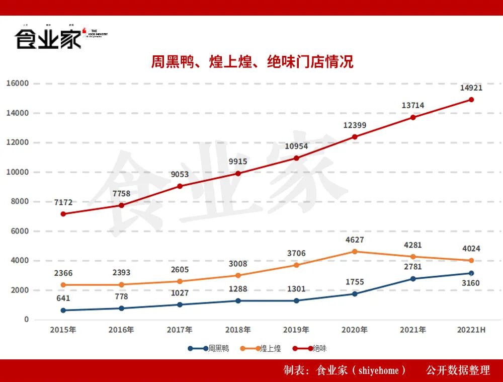 周黑鸭“落后”被普遍归因到门店规模上。截至2021年末,绝味食品在中国大陆地区门店总数13714家,全年净增长1315家,门店数量远远超过煌上煌、周黑鸭门店数量之和,可谓是当之无愧的“鸭脖一哥”。同期,周黑鸭门店仅为2781家,不及绝味的零头。