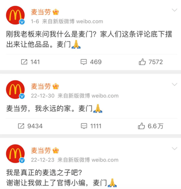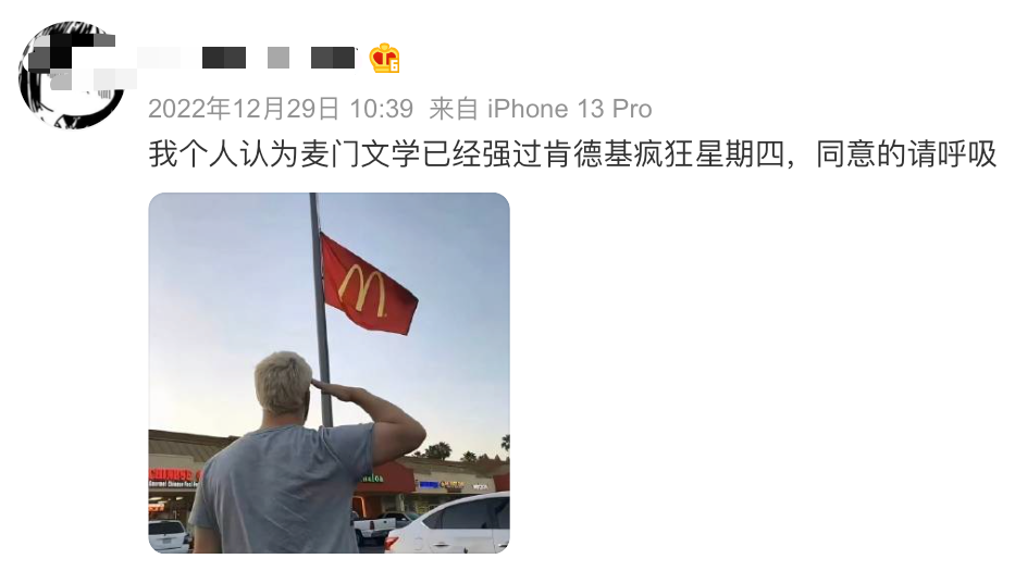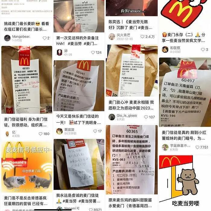 其中最有梗的“麦门”一词,实际在2022年末便有出圈的迹象,它是“麦当劳忠实门徒”的简称,也带有模仿基督教语“阿门”的意味,表示对麦当劳的信仰和崇拜。