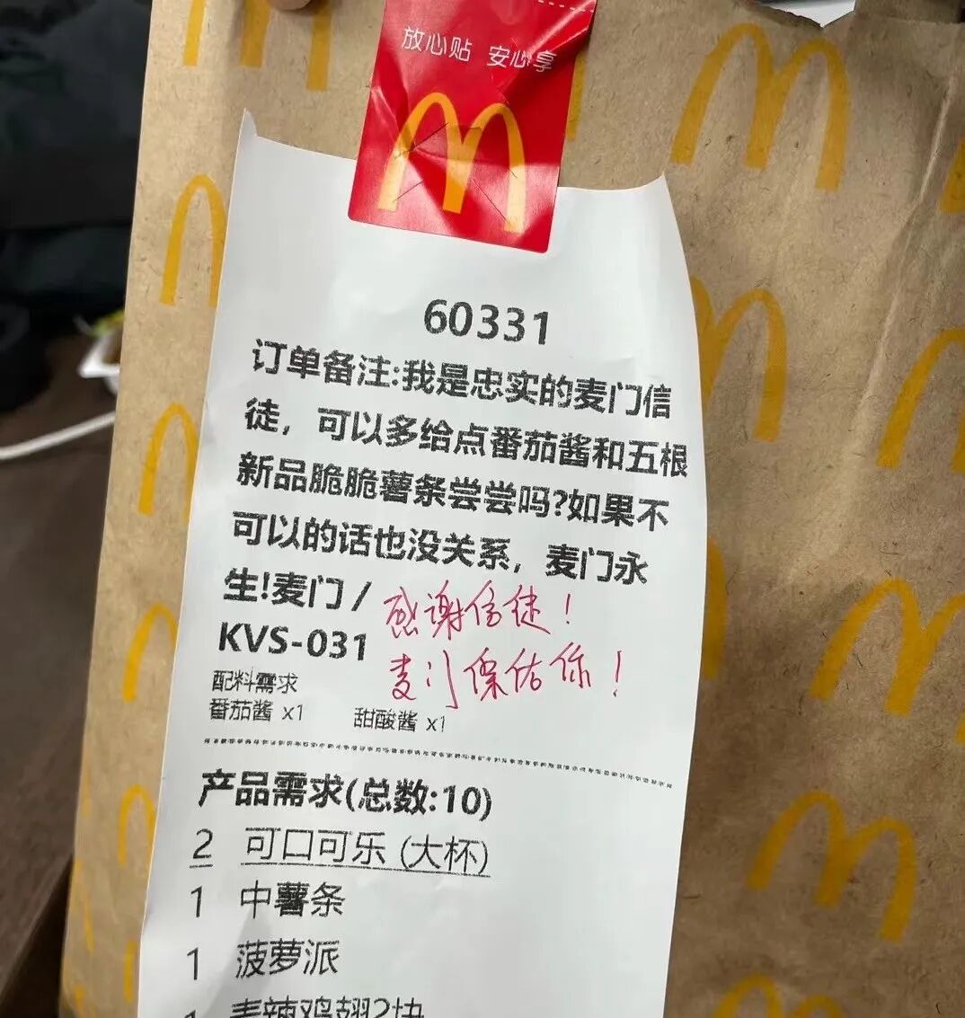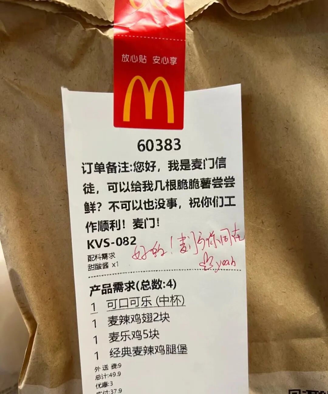 其中还有麦当劳店员针对订单备注的回复,俨然一副“教会门徒一家亲”的局面。