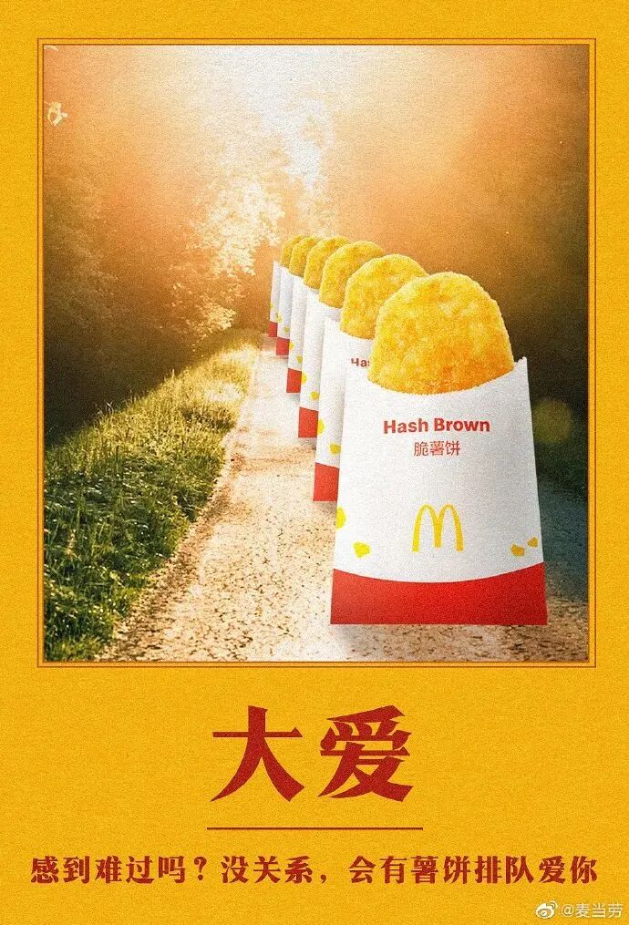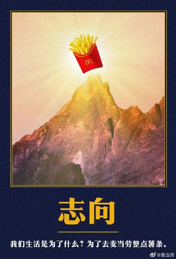 突降的“麦门文学”,官方恰逢时宜的接梗,一切似乎顺理成章,这究竟是麦当劳有心的“安排”还是一场美丽的“意外”?我更倾向于这是一次品牌和粉丝间绝妙的“合谋”。“麦门文学”直击人们的情绪诉求,以自我调侃、自嘲的方式进行心灵抚慰,而麦当劳在陪伴和制造欢乐的品牌主张下,也甘之若饴的加入其中,严格来说,这是彼此的互相成就。
