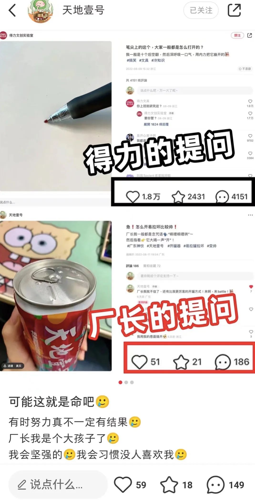 内容风格大致如此,看来天地壹号的社交网络运营也是一群有趣的灵魂,把官方账号打造成了年轻人更愿意亲近的段子手。
