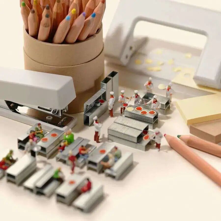 将人物无限缩小、生活场景无限放大,创作成各种日常场景或银座街道风景,田中达也以MUJI各式产品为基础和灵感,结合立体模型人偶打造的迷你世界,不仅为我们带来一个观察产品的全新视角,展现了产品的别样乐趣和艺术感,也不知不觉中唤醒了大家久违的想象力和童心。毕竟在阿广看来,上面这些产品,不过是随处可见的平常小物,平平无奇的日常工具而已。但经过田中达也巧妙的构图和创意的摄影,这些普普通通的订书机、笔记本等产品,仿佛被赋予了崭新的生命和灵魂。就好像童年幻想意外地照进了现实,我们曾经埋藏在心底的小人国真的“复活”了,让人感受到扑面而来的治愈感,观众们自然也乐于前去欣赏这些作品,沉迷于梦幻的小世界中。不过遗憾的是,好像目前「small MUJI」展只在东京举办,咱们全年无休的打工人,暂时是没有福气去现场观看了。@田中达也,啥时候把展览开到中国来?阿广先提名上海!![]()