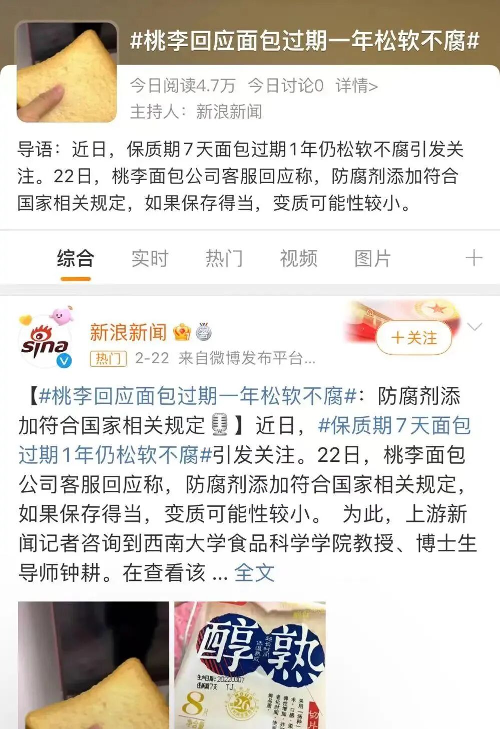 面对网友提出的“为何短保面包能一年不腐”的问题,桃李面包公司客服回应称,公司有严格的添加剂管控和溯源系统,不存在添加剂过量使用的情况。面包经过高温烘烤灭菌处理,如果保存得当,出现变质的可能性就比较小,但已经超出保质期的产品,即使未出现变质现象,但微生物含量较多,安全起见,并不建议食用。