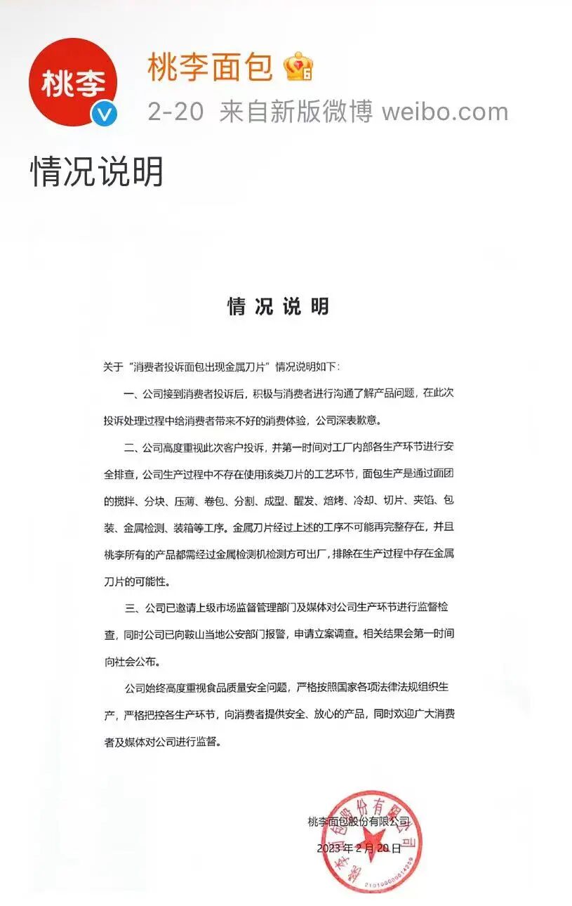 有消费者称,在购买的桃李面包生产的金枪鱼三明治产品中发现一个2至3厘米生锈美工刀片。对此,桃李面包于2月20日回应并澄清,称已排除在生产过程中存在金属刀片的可能性,并已向当地公安部门报警并申请立案调查,相关结果会第一时间向社会公布。