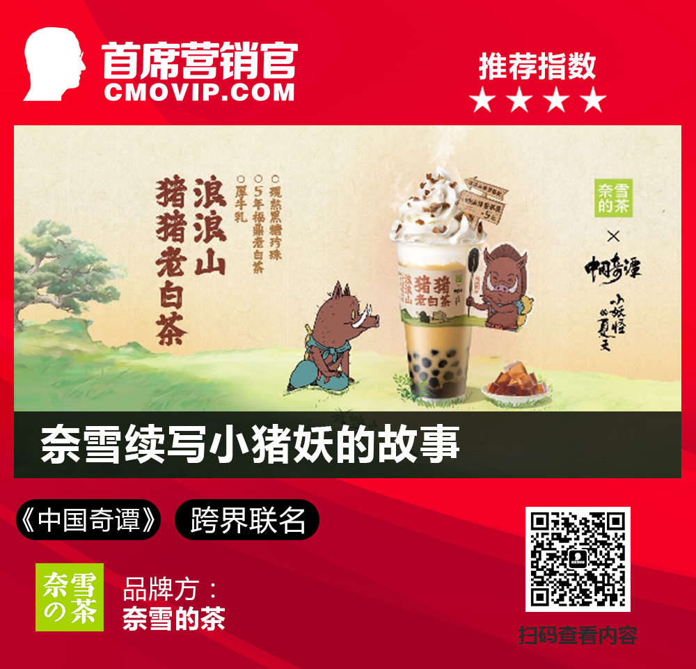 在《中国奇谭》收官之际,奈雪正式上线与《中国奇谭》之「小妖怪的夏天」的联名新品,续写浪浪山小猪妖的故事。早在年前,奈雪正式官宣与《中国奇谭》的联名预热海报,成为《中国奇谭》联名的首个新茶饮品牌。点评:《中国奇谭》作为开年第一爆款,吸引了众多用户关注,为联名产品做好了扎实的铺垫,这款新的联名产品必定爆发更大的势能。