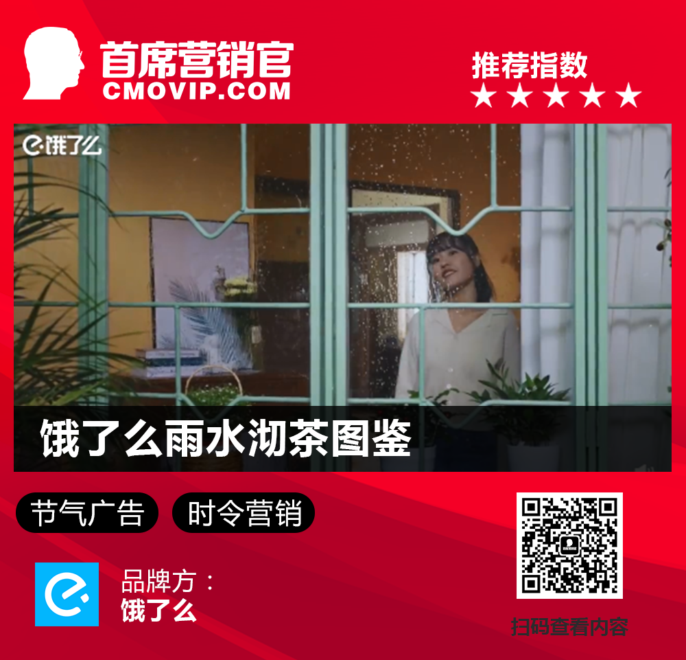雨水一落,春天就真的来了。饿了么上线雨水节气广告《雨水一壶茶 万物皆可沏》。同时,饿了么联合大龙燚火锅,打造两款独具本地特色的产品「老鹰茶火锅」「绿茶麻将奶冻」,以此作为噱头产品。诠释“万物可沏”的活动主题。点评:饿了么通过“雨水一壶茶 万物皆可沏“的特别演绎和渗透,将时令与美食做强关联,并传递饿了么提供放心点准时达的外卖服务的长期心智。