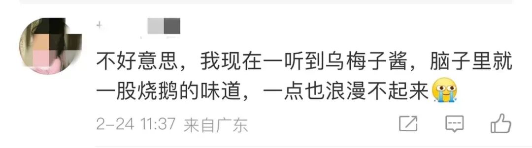 复盘一下《乌梅子酱》走红的时间,2月14日情人节,这首作品迎来了真正意义上的“火爆”。“你浅浅的微笑就像乌梅子酱”成了今年最热的表白话语,几乎能完美适配所有的情人节视频BGM。而“我尝了你嘴角唇膏薄荷味道”变相撒狗粮。